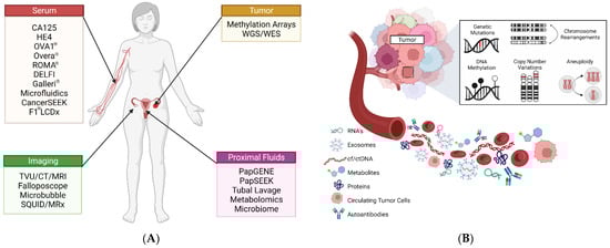 Overview of ovarian cancer screening and diagnostics. (A) Relevant emerging strategies for screening and detection of HGSC. (B) Circulating tumor biomarkers that can be assayed for screening and diagnostic purposes.