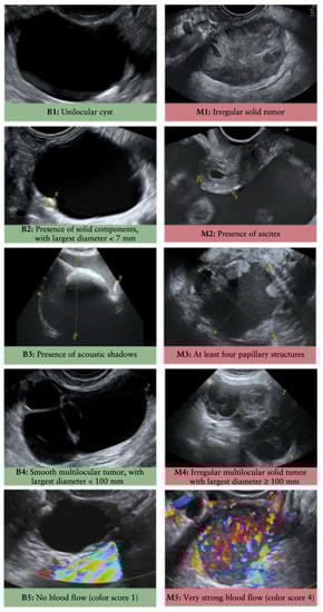 Representative sonographic images of benign (B1–B5) and malignant (M1–M5) ovarian masses. Features in each panel are reviewed based on the IOTA simple rules to evaluate malignancy of ovarian lesions. In general, the presence of irregular shaped bodies, papillary projections, and/or internal blood flow are predictive of malignancy. Images provided from Kaijser et al. []. Used with permission.