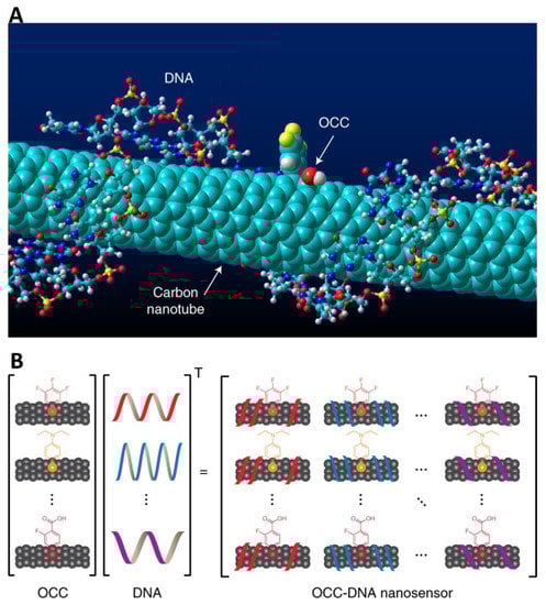 Molecular model and array construction of OCC-DNA nanosensor elements created by Kim et al. []. (A) Fabricated molecular model of a single OCC-DNA nanosensor with ssDNA wrapped around a semi-conducting single-walled nanotube (SWNCT) modified with organic color sensors (OCC). (B) Nanosensor array construction is generated from a matrix combination of OCC-modified SWNCTs with DNA. Used with permission.