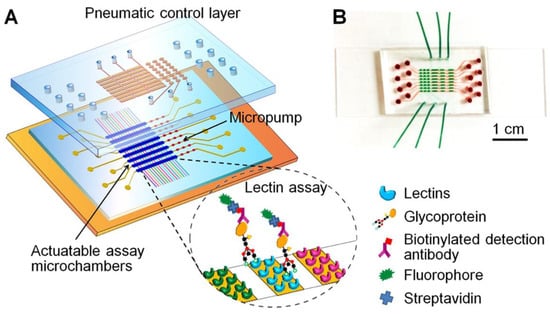 Schematic of the antibody-lectin barcode microfluidic platform proposed by Shang et al. []. (A) The integrated microfluidic lectin barcode platform contains eight identical microchambers that lay perpendicular to an array of lectins patterned on the chip’s surface. Pneumatic actuation within the assay chamber allows for mixing and capture of glycoproteins to the lectin array. (B) Digital image of the microchip with loading chambers in red and pneumatic control layers in green. Reprinted under the Creative Commons CC BY-4.0 license.
