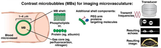 Principles of contrast-enhanced ultrasound imaging with contrast microbubble reported by Pysz et al. [] Microbubbles generally consist of a gaseous core that is enveloped in a lipid or protein shell that may or may not be “decorated” with additional components for stability. Due to their micron size, microbubbles are able to travel within tiny microvascular spaces, including microcapillaries that may be present in solid lesions. Used with permission.