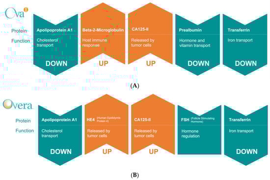 Biomarkers used in the OVA1® and Overa® assays developed by Aspira Women’s Health Inc. (A) The OVA1® assay incorporates TVU findings and menopausal status with changes in serum proteins ApoA-1, B2M, CA125, Transthyretin (Prealbumin) and Transferrin. (B) The Overa® assay is the second-generation model which incorporates two new serum biomarkers HE4 and FSH, along with three of the original biomarkers defined in the OVA1® assay. Image was recreated with permission from Aspira Women’s Health [].