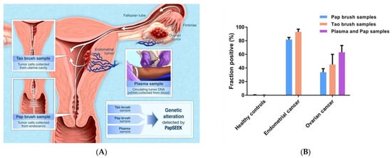 In their seminal but limited study of 46 patients, Kinde et al. proposed investigating cells and cfDNA derived from Pap specimens for genetic alterations []. The resulting method, termed the “PapGene” test, employs the so-called Safe Sequencing System (Safe-SeqS) to achieve reliable detection of mutations from the cells and cellular debris collected via Pap specimens in any of 12 genes (APC, AKT1, BRAF, CTNNB1, EGFR, FBXW7, KRAS, NRAS, PIK3CA, PPP2RIA, PTEN, and TP53) found to be mutated in ovarian and endometrial cancers []. The authors reported that in their multiplexed assay, mutations in one or more of these 12 genes were found in 100% and 41% of endometrial and ovarian cancer cases analyzed, respectively. Importantly, none of these mutations were detected in the women without cancer that were tested []. In a follow-up, proof-of-principle study, the same group published PapSEEK (Figure 7), a genetic test using DNA recovered from endocervical and other biofluids. PapSEEK exhibited 33% sensitivity at 99% specificity for the detection of ovarian cancer from Pap specimens alone. The authors reported that using a Tao brush to sample fluids from inside the intrauterine cavity was able to increase sensitivity to 45% and specificity to 100%. Moreover, combining targeted sequencing for circulating tumor DNA in both patient plasma and Pap fluids further increased sensitivity to 63% at 100% specificity (Table 1 and Table S3) []. A caveat to reiterate however is that p53 mutations detected in uterine lavage can often be nonspecific with respect to the presence of cancer as other studies have reported that low-frequency p53 mutations are present in healthy tissues of the majority of women of all age groups []. The minimally invasive collection of Pap and Tao brush fluids employed by PapSEEK and PapGene, paired with the high diagnostic performance of the assays, has nonetheless highlighted the potential for Pap-based genetic testing.