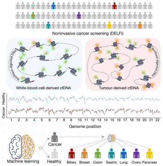 - Cristiano, S.; Leal, A.; Phallen, J.; Fiksel, J.; Adleff, V.; Bruhm, D.C.; Jensen, S.Ø.; Medina, J.E.; Hruban, C.; White, J.R.; et al. Genome-wide cell-free DNA fragmentation in patients with cancer. Nature 2019, 570, 385–389. [Google Scholar] [CrossRef]