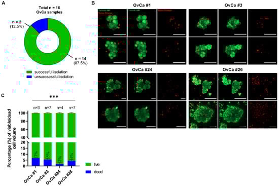Isolation of PDM was successful in 87.5% (14/16) of the tumor samples (Figure 1A) with varying amounts of available PDM for downstream analyses such as live–dead staining, immunohistochemical characterization, protein signaling pathway analyses and efficacy drug testing of standard-of-care therapy as well as immunotherapy. PDMs were cultured in suspension in the absence of serum for a maximum of three weeks. No correlation was observed between successful isolation of PDM and available clinical patient data such as age, lymph node spread, distant cancer spread, perineural invasion or FIGO stage (Table S1). PDM viability was assessed by parallel staining with Calcein-AM and SYTOX™ Orange (Figure 1B). The 2D projections of 3D images displayed highly viable PDM with few dead cells. Dead PDM cells (according to nuclear SYTOX™ Orange staining) detached from PDM and thus observed mostly as single cells floating in the culture media. The quantification of the viable cell volume and dead cell volume in 3D projections of four exemplary OvCa PDM models are shown in Figure 1C. In each analyzed model, ≤7% of the total PDM cell mass represented dead cells confirming robust PDM viability.
