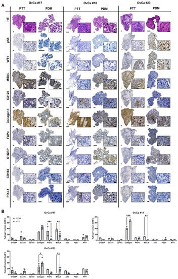 In summary, the analyzed stromal and ECM components were found to be expressed in the majority of generated OvCa PDM models. In most cases, the observed expression pattern of respective markers in PDM did not significantly differ from expression in corresponding PTT sections.