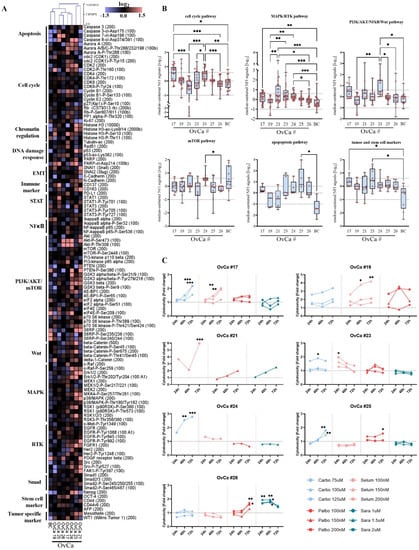 Next, we sought to investigate the carboplatin drug mode-of-action within OvCa PDM. Therefore, the carboplatin-responding OvCa PDM #24 was treated with carboplatin at a concentration of 75 µM, which had significantly induced PDM cytotoxicity in this model (see Figure 3C). Protein NFI signals were measured at three different time points and normalized to vehicle control. Proteins revealing >50% difference in TR signals (Figure S3) were selected to focus on the strongest changes in abundance. Cell cycle progression proteins (phospho-CDK2, CDK1) and phospho-Histone H3 (Ser10), affecting chromatin condensation during cell division, were downregulated quickly within 30 min (Figure 4C). After 4 h of treatment, TR signals of phospho-Aurora A/B/C protein and Histone H3 was strongly increased (Figure S3). Longer incubation with carboplatin (72 h) resulted in strong downregulation of these proteins (Figure 4C). Diminished abundance of cell cycle proteins after 72 h of carboplatin treatment differed significantly from vehicle control (p < 0.001) and from early treatment (4 h; p < 0.001). While levels of cell cycle-related proteins decreased over time, apoptotic markers such as cleaved caspases as well as acetylated p53 were elevated after 72 h (Figure S3). Induction of apoptosis-related proteins was already observed after 4 h of treatment (Figure 4C) with increasing abundances of cleaved caspase-7 and acetylated p53 (Figure S3). Focusing on down-stream PI3K/AKT/mTOR/Wnt pathway regulation, the abundances of mTOR effector proteins (S6RP, S6RP-phospho) were quickly upregulated after immediate (0.5 h) carboplatin treatment (Figure S3), which is in line with previous reports about transcriptional regulation of stress response by the mTOR pathway [35]. We also observed additional elevation of mTOR pathway-related proteins after 4 h of carboplatin treatment. Furthermore, overactive mTOR signaling might have resulted in increased p53 activation through upregulated acetylated p53 levels (Figure S3) as described before [35]. The PI3K/AKT/mTOR pathway was significantly upregulated within 4 h of carboplatin treatment compared to vehicle control (p = 0.021; Figure 4C). Similar to proteins related to cell cycle, this pathway was completely abrogated as compared to vehicle control after 72 h of treatment (p < 0.001; Figure 4C). Changes in protein abundance differed significantly during all three measured time points (0.5 h vs. 4 h: p = 0.003; 4 h vs. 72 h and 0.5 h vs.72 h: p < 0.001 Figure 4C). Pronounced, significant downregulation of MAPK/RTK pathway occurred after 72 h of treatment (p = 0.017; Figure 4C). The observed proteomic changes within MAPK/RTK-related proteins over time were significant (0.5 h vs. 4 h: p = 0.009; 4 h vs. 72 h: p < 0.001; Figure 4C). Thus, carboplatin treatment of OvCa #24 illustrated substantial and time-dependent changes in TR signals. Short treatment with carboplatin apparently triggered the induction of stress responses while longer treatment duration caused the induction of apoptosis.