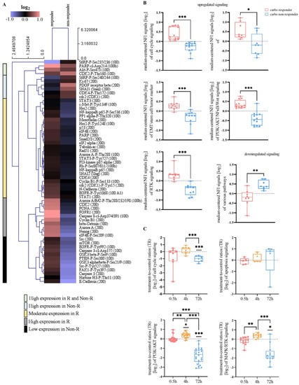 Carboplatin drug response in OvCa PDM correlates with the activity of diverse signaling pathways. (A) Heat map of protein abundances (calculated from median-centered NFI values) averaged over carboplatin-responder (R) and non-responder (Non-R) OvCa PDM. Carboplatin responders and non-responders were grouped according to significant treatment effects from functional compound testing (Figure 3C). Only proteins with >20% increased or decreased abundance between responder and non-responder group were selected. Data was HCL clustered with Euclidean distance (average linkage). (B) Signaling pathway activation in carboplatin-responder vs. non-responder OvCa PDM. Proteins were sorted according to their pathway affiliation and according to upregulation or downregulation within responder group. * p < 0.05, ** p < 0.01, *** p < 0.001, Mann–Whitney-U-test. (C) Proteomic on- and off-target pathway effects in carboplatin-treated (75 µM) OvCa #24 PDM analyzed by RPPA. Treated PDM were analyzed from an immediate (0.5 h), an early (4 h) and a late (72 h) treatment time. For each time point, protein values are displayed as log2-transformed treatment-to-control signal ratios (TR) calculated from NFI signals of treated PDM and corresponding vehicle control (DMSO). Only proteins with >50% differential protein abundance compared to vehicle control were selected. Straight lines above plots indicate statistical significances compared to vehicle control. * p < 0.05, ** p < 0.01, *** p < 0.001, One-way ANOVA using nonparametric Kruskal–Wallis with Dunn’s ad hoc test.