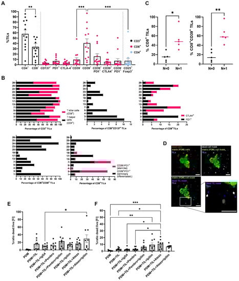 CPI treatment in OvCa PDM-TIL co-cultures increased functional TIL killing capacity. Autologous TIL populations were isolated and expanded from OvCa tissue specimen. (A) Percentages of different TIL populations within CD3-, CD8- and CD4-positive T cells of different models were quantified by multicolor flow cytometry. Data are shown as means ± SEM of at least n = 10 OvCa samples. * p < 0.05, ** p < 0.01, *** p < 0.001, ANOVA with Holm-Šídák’s post hoc test. (B) Phenotypes of extracted TIL populations shown separately for each OvCa model. (C) Percentages of CD8+ and CD8+CD39+ TILs in OvCa patients with lymph node spread (n = 1) and without lymph node spread (n = 0). All points with median are shown. * p < 0.05, ** p < 0.01, Mann–Whitney-U-test. (D) PDM killing effects were measured in an image-based assay format as ratio of fluorescent intensities (FI) of dead cells vs. viable PDM cells. Per treatment n = 3 PDM in three replicates were analyzed. Masks for viable PDM (Calcein-AM staining), dead cells (SYTOX™ Orange dead cell staining) and TILs (CellTracker™ Deep Red staining) were applied using Imaris 8.0 software. Scale bars indicate 50 µm. FI from TILs were subtracted from the total dead FI. (E,F) Killing effects of autologous TILs on corresponding PDM in co-cultures treated with immune checkpoint inhibitors (CPI). TILs of OvCa #24 (E) and #26 (F) were co-cultured with n = 15 PDM using an E:T ratio of 4:1. * p < 0.05, ** p < 0.01, *** p < 0.001, ANOVA with Holm-Šídák’s post hoc test. Pembro: pembrolizumab 60 µg/mL; Ipilim: ipilimumab 50 µg/mL; Atezo: atezolizumab 50 µg/mL.