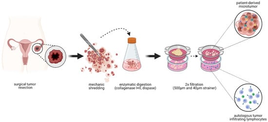 PDM and TIL isolation from OvCa tumor samples within 3 h after receipt of the tumor sample. Tumor tissue derived from surgical tumor resection is kept in culture media for transportation. Immediately after receipt of the sample, the tissue is mechanically disrupted into smaller pieces and enzymatically digested for 2 h. Afterwards, the digested tissue gets filtered twice using cell strainers. Within the first filtrate, tumor-infiltrating lymphocytes are obtained and are ready for culturing or cryopreservation. From the residue of the second strainer, PDMs are gained and are ready for culturing or cryopreservation. (Created with Biorender.com).