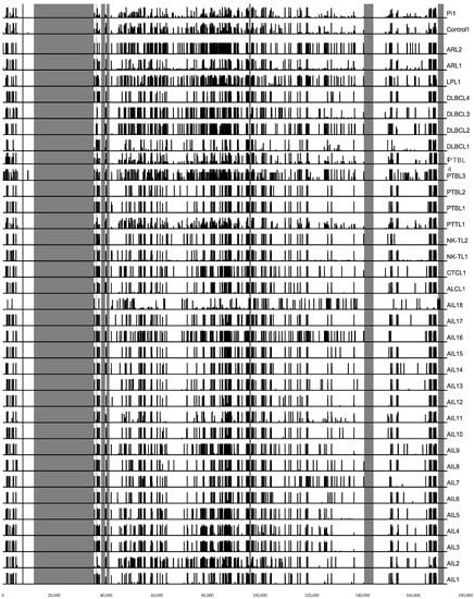 The whole genome sequences obtained for the patients were mapped to the reference genomes NC_007605.1 for EBV-1 and NC_009334.1 for EBV-2. Given that the latent EBNA-2 and -3 genes are the most divergent genes between EBV-1 and -2, we used the ratio “number of reads mapping to EBV-1 EBNA-2, -3 genes/number of reads mapping to EBV-2 EBNA-2, -3 genes” to determine the EBV type of each sample (Table 2). All but one patient sample (AIL18, which belonged to a native North African woman) harbored EBV-1. The raw reads were then aligned to the EBV-1 reference genome, and genetic variations were detected using the Varscan tool (Figure 1 and Table S1). T Figure 2 illustrates the relative genetic variations among the genomes for the different strains compared to the reference. For the AITL patients, although no consensual sequence of the EBV genome was found, it is noticeable that AIL1/6/7/8/10/11/12/13/14/15/17 patients had very close strains. The same observation was true for the AIL3/4/5/9 patients. It is also noteworthy that two strains were particularly mutated: AIL2 and AIL16.