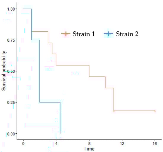 Kaplan-Meier curve showing significant differences in the survival of AITL patients carrying strain 1 compared to those carrying strain 2 (p = 0.048).