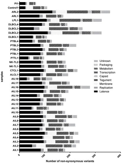 EBV non-synonymous mutation analysis according to nine main gene categories: latency, replication, membrane glycoprotein, tegument, capsid, transcription, metabolism, packaging, and unknown function.