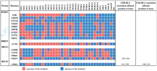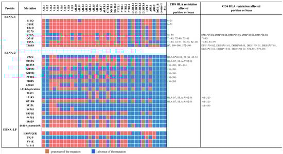 Main mutations observed among the latency proteins EBNA-1, EBNA-2, and EBNA-LP. CD8- and CD4-HLA restriction-affected position or locus are mentioned. Mutations of AIL18, which is an EBV-2, are not reported.