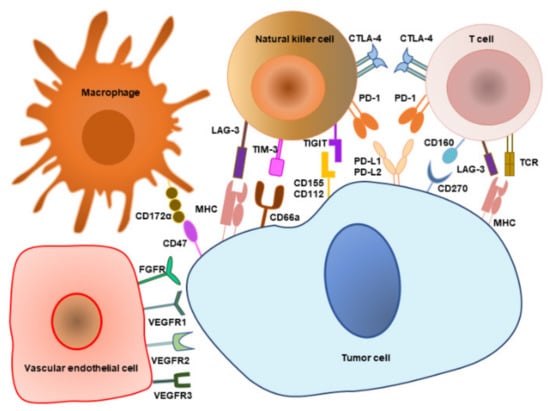 Antiangiogenic agents strengthen antitumor immunity by suppressing various angiogenesis dysplastic immune processes [118]. Therefore, when combined with immunotherapy, antiangiogenic drugs may produce better clinical outcomes, and there are a number of clinical trials that are currently in progress (Table 3). It should be noted that the VEGFR family has different connections with immune checkpoints because though VEGFR1 expression is not associated with PD-1 and PD-L1 expression, VEGFR2 and VEGFR3 are related to PD-1 and PD-L1, respectively [87].