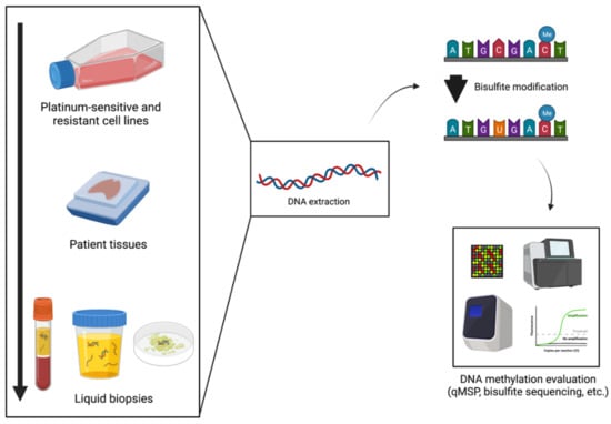 To set up a reliable biomarker predictive of response to chemotherapy, one needs to identify relevant genes by compiling and testing training and validation cohorts and comparing DNA methylation status among specific cohorts of patients, specifically, in this setting, patients who responded (either completely or partially) to treatment and those who did not respond and endured a poor outcome [57,67,71]. Additionally, adjusting for demographic and clinicopathologic factors (age, gender, grade, stage, baseline characteristics of patients, etc.) is very relevant since DNA methylation biomarkers may lose their predictive value after adjustment in multivariable models. Moreover, cancer cell line testing is important to illuminate how chemotherapy-sensitive and -resistant cells react to treatment, evaluating whether the methylation profile changes over time and if the use of a demethylating agent sensitizes resistant cells [72]. For that purpose, the collection of patient tissue samples (for instance, biopsies, FFPE tissue samples, frozen samples, etc.), the extraction of DNA (assuring the best possible quality), and performing bisulfite treatment (or variations, such as with the use of methylation-sensitive endonucleases) followed by targeted MSP-based methods are required (Figure 1). Then, if sensitivity, specificity, positive predictive value (PPV), negative predictive value (NPV), and overall accuracy reach high levels of performance, a biomarker is a candidate for further testing in body fluids to determine whether it will constitute a reliable biomarker for clinical use [65].