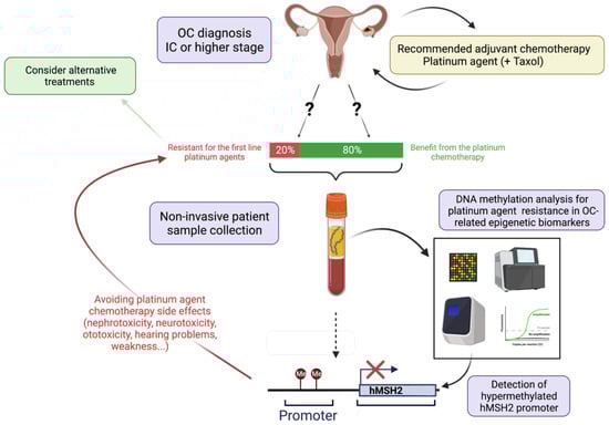 Figure 3 illustrates the ideal process of how a biomarker of platinum-based agent resistance (in this case, hMSH2 promoter hypermethylation) could be validated and confirmed as a predictive biomarker, assisting in the therapeutic decision for OC patients, improving survival and quality of life.