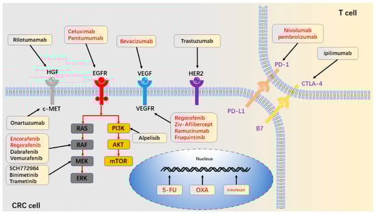 Currently FDA-approved (red) or promising (black) anti-CRC drugs. HGF: hepatocyte growth factor; c-MET: mesenchymal-epithelial transition factor; VEGF: vascular endothelial growth factor; EGFR: epidermal growth factor receptor; PI3K: phosphoinositide 3-kinase; AKT: protein kinase B, also known as PKB; mTOR: mammalian target of rapamycin; MEK: mitogen-activated protein kinase; ERK: extracellular signal regulated kinase; CTLA-4: cytotoxic T-lymphocyte-associated antigen 4; B7: B7 ligand; PD-1: programmed death-1; PD-L1: programmed death ligand 1; 5-FU: 5-fluorouracil; OXA: oxaliplatin.
