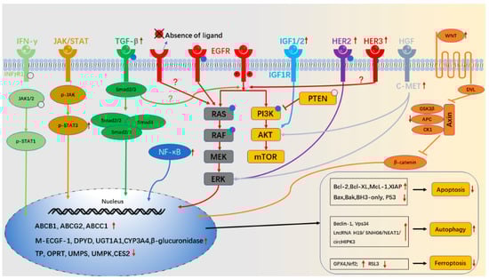 The changes of drug targets and signaling pathways lead to the development of CRC resistance. IFN-γ: interferon-γ; JAK/STAT: janus kinases/signal transducer and activator of transcription; PTEN: phosphatase and tensin homolog; APC: adenomatous polyposis coli; TP: thymine phosphorylase; OPRT: orotate phosphoribosyl-transferase; UMPS: uridine monophosphate synthetase; UMPK: UMP kinase; CES2: carboxylesterase 2; ABCB1: multi-drug resistance protein 1, MDR1, P-gp; ABCG2: breast cancer resistance protein, BCRP; ABCC1: multi-drug-resistance-associated protein 1, MRP1; UGT1A1: uridine diphosphate glucuronosyltransferase 1A1; CYP3A4: cytochrome P450-3A4.