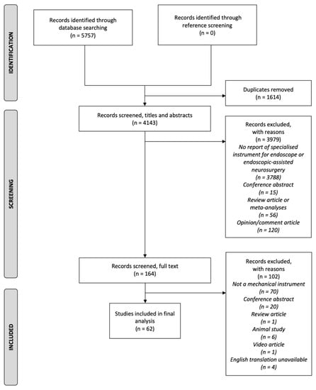 Eligible articles were excluded if they met any of the following criteria: the study evaluated a device or system that was not a mechanical instrument with the aim of manipulating tissue; the instrument was not applied to endoscopic or endoscope-assisted neurosurgery; or the study was not an original research paper.