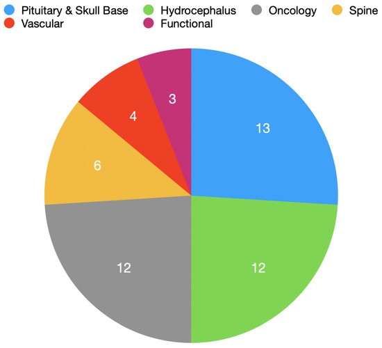 Novel instruments in included studies were applied to a variety of specialities (Figure 3). The most common application of a novel instrument was for the treatment of pituitary tumours using the endoscopic endonasal transsphenoidal approach (eight instruments), followed by endoscopic third ventriculostomy for hydrocephalus (seven instruments).