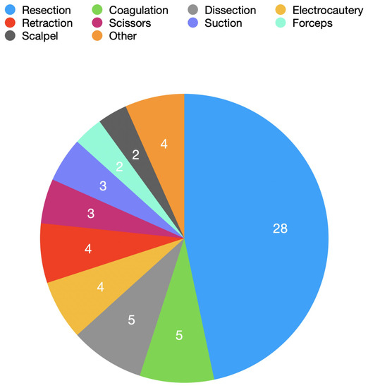 A total of 50 specialised instruments for endoscopic or endoscope-assisted neurosurgery were identified (Table 1). Most available specialised instruments were for general use in all endoscopic and endoscope-assisted neurosurgical approaches, but served a single function. The most common function of these instruments was resection (28 instruments), followed by dissection (5), coagulation (5), electrocautery (4) and retraction (4) (Figure 4).