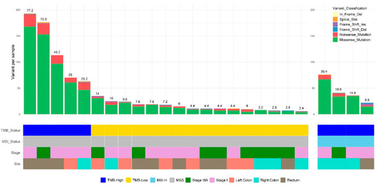 Summaries of variant profiling in TMB-High and TMB-Low Stage I and IIIA CRC. Numbers above bar chart denote TMB values of each sample.