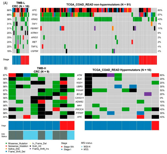 Co-Oncoplot of Stage I and IIIA CRC. (A) Top ten mutated genes in TMB-Low CRC and nonhypermutators TCGA COAD-READ cohort specimens. (B) Differentially distributed genes in TMB-High compared with TMB-Low and their distribution in TCGA COAD-READ hypermutator group.
