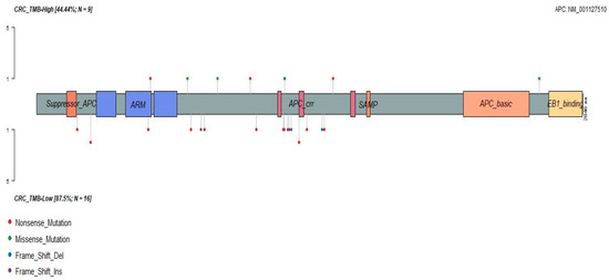 APC was less frequently mutated in TCGA hypermutator specimens, and this trend was repeated in our dataset, but did not reach the significance threshold. When APC was mutated in the TMB-H cancers, a more diverse composition of variant types was observed: three missense, three nonsense, one frameshift indels and one splice site variant. Conversely, among the 16 TMB-L samples, none of the APC alterations was missense/synonymous. Instead, we observed potentially high-impact deleterious APC mutations consisting of fourteen nonsense mutations and five frameshift indels. The lollipop plot (Figure 3) plots the distributions of the APC variants in the context of functional protein domains. The TMB-H CRC mutations were dispersed over the codons of 516–2620, while the TMB-L CRC contained 58% (11/19) of amino acid changes within the mutation cluster region (MCR, codons 1282–1581), which is in the central part of the APC coding frame involved in β-catenin downregulation [18]. The clustering of the APC variants (49%) also can be observed in the MCR of the TCGA COAD-READ nonhypermutators (Supplementary Figure S2).