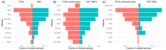 Pathway enrichment analysis in (A) TCGA−COAD−READ and CRC specimens, (B) TMB-H group compared with TCGA−COAD−READ hypermutator group, (C)TMB-L group compared with TCGA−COAD−READ nonhypermutated cohort.