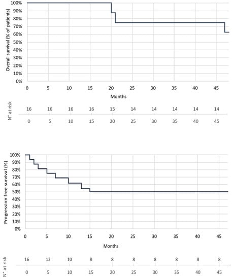 Regarding the patients’ outcome at the time of data collection, i.e., within a median follow-up time of 22 months (6–50 months), eight had progressed, and of these, three had died of melanoma. In addition, all patients treated in the adjuvant setting were free of relapse. The overall survival rate of the patients with metastatic/unresectable melanoma was 75%, and their progression-free survival rate was 50% (Figure 2).