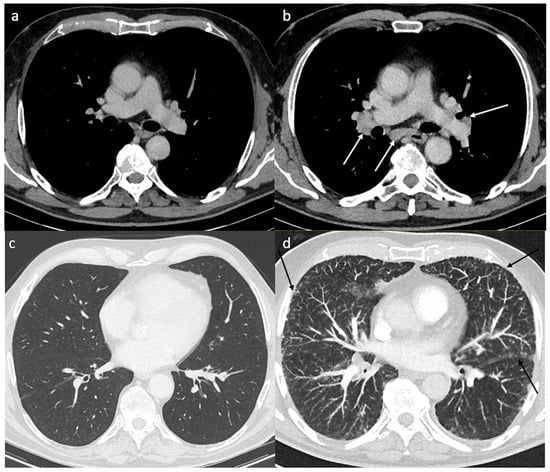 Typical findings of pulmonary sarcoidosis. Axial contrast enhanced computed tomography (CT) shows no mediastinal lymph node enlargement (a) and no parenchymal disease (c) before treatment. Five months after immunotherapy, axial enhanced CT shows typical bilateral and symmetric hilar and subcarinal lymph nodes (b) and multiple micronodules with a perilymphatic distribution (subpleural and perifissural nodules) (black arrows-d).