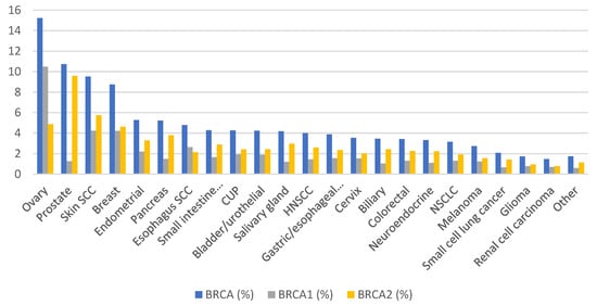 Prevalence of somatic BRCA1/2 mutations across different tumor types. Adapted from Sokol et al. [20], copyright 2020 the authors, American Society of Clinical Oncology under the Creative Commons Attribution Non-commercial No Derivatives 4.0 License (https://creativecommons.org/licenses/by-nc-nd/4.0/, accessed on 12 May 2022). The figure has been modified for the purposes of this review.