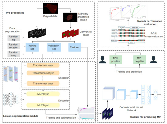 With the development of artificial intelligence (AI) technology, radiomics and machine learning methods have gradually been applied to the preoperative prediction of MVI in liver cancer, and excellent performance has been achieved [21,22]. For example, Jiang et al. [23] included a study of 405 HCC patients and extracted 7302 radiomic features for predicting MVI from their radiomics data. The area under the receiver operating characteristic curve (AUC) of the extreme gradient boosting (XGBoost) algorithm reached 0.887. Nebbia et al. [24] retrospectively collected preoperative multiparametric liver magnetic resonance imaging (MRI) scans from 99 HCC patients and regions of interest (ROI) were manually segmented by radiologists. First, the researchers extracted radiomic features in the region, which were then fed into a machine learning model for predicting MVI. The best performance was obtained when a combination of multiple MRI sequences was used, with an AUC of 0.8669. In recent years, deep learning technology has gradually emerged and has been applied to various medical tasks. In related studies on the preoperative prediction of MVI, this technique has also been shown to have a stronger generalization ability. Some researchers constructed a 3D convolutional neural network (-CNN), which was able to perform preoperative diagnosis of MVI in HCC patients by inputting MRI sequences, with the highest AUC of 0.81 and a sensitivity of 0.69 [25]. In addition, a 2D-CNN model was applied to this task [26] and showed excellent performance. However, it should be emphasized that most published studies have required the help of experienced radiologists to manually segment the ROI or volume of interest (VOI), which is inefficient and cannot be automated and batched. Developing an end-to-end deep learning method that integrates raw data preprocessing, automatic ROI segmentation, and MVI prediction is conducive to promotion.