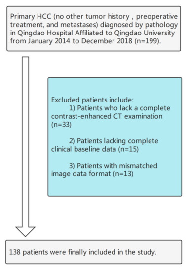 Data of patients with HCC who underwent liver surgery at Qingdao University between January 2014 and December 2018 were retrospectively collected. Tumor specimens from each patient underwent postoperative pathological examination for MVI. The inclusion criteria were as follows: (1) HCC was diagnosed based on pathology; (2) partial hepatectomy was the first treatment, and (3) contrast-enhanced CT examination was performed within 1 month before surgery, and all periods were complete. Patients were excluded from the study based on the following criteria: (1) chemotherapy, interventional therapy, targeted therapy, and other treatments before partial hepatectomy; (2) history of other tumors; (3) incomplete imaging and clinical medical records; (4) lesion had metastasized. Ultimately, 138 patients were selected for the study and their radiological and clinical data were obtained. The patient selection process is shown in Figure 2.