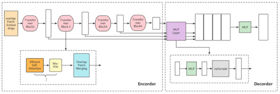 Figure 3 is a schematic diagram of the architecture of the model, including a novel hierarchical transformer encoder, which outputs multiscale features and does not require positional embedding. This avoids the difference in resolution during testing and training and results in performance degradation. The decoder adopts a lightweight multilayer perceptron (MLP) decoder to aggregate information from different layers, thereby combining the local and global attention. Specifically, the encoder removes the traditional positional embedding and replaces it with a mix-feed-forward network (Mix-FFN), which introduces a 3 × 3 depthwise convolution in the feed-forward network to transfer positional information. The decoder only introduces several MLP layers and does not perform complex operations, which significantly reduces the number of parameters and computations. Moreover, for the patch embedding of the network, the patch with the overlap operation is designed such that the non-independent design can ensure local continuity. For traditional self-attention, we also refer to [32] to employ efficient self-attention, which mainly increases the hyperparameter sr_ratio based on the original to control the size of the parameter matrix.