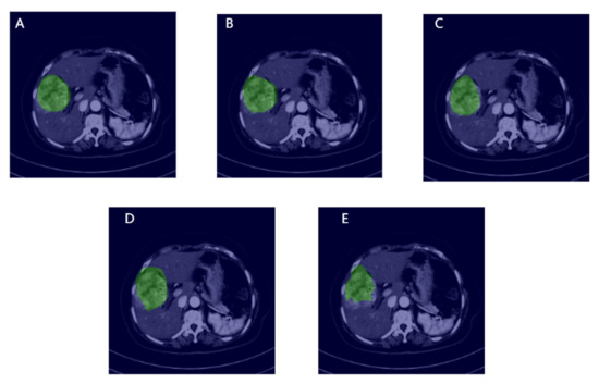 Visualization of manual annotation and segmentation of each model, in which the green area is the ROI, and the rest are the original slices: (A) Represents manual annotation; (B–E) represent MVI-Mind, Swin Transformers, DeepLab V3+, U-Net segmentation, respectively.