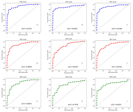 Receiver operating characteristic curves (ROCs) of all CNN models and their corresponding AUC values. (A–C) Represent the prediction results of MVI-Mind during AP, PVP, DP, respectively; (D–F) represent the prediction results of ResNet-34 during AP, PVP, DP, respectively; (G–I) represent the prediction results of Inception V3 during AP, PVP, and DP, respectively.