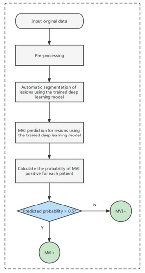 It is worth noting that the clinical method that is generally used for diagnosing MVI is postoperative pathological detection, wherein the tissue specimens taken during the operation are observed under a microscope; this is accurate but not helpful for preoperative clinical decision making [19]. Preoperative prediction of MVI can help to guide surgical strategies for liver transplantation and hepatectomy. For example, doctors would know in advance whether a patient has MVI; this would help them to formulate precise surgical strategies. Early prediction of MVI is also beneficial for doctors to take measures to prevent recurrence and metastasis before surgery, including systemic therapy or immunotherapy [20]. Therefore, the use of cutting-edge technologies to develop preoperative noninvasive MVI prediction tools can better guide clinical decision making in HCC patients.