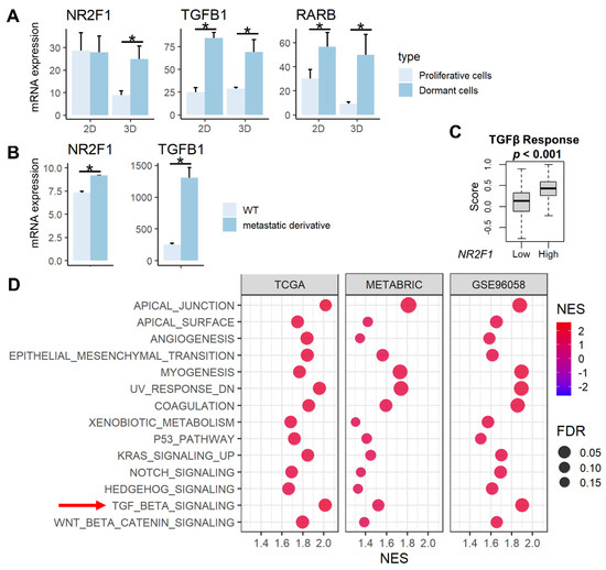 Association between NR2F1 and TGFβ and pathways enriched in high NR2F1 tumors. (A) Barplots showing mRNA expression of NR2F1, TGFB1, and RARB in the dormant D2OR cells (dark blue) and proliferative D2A1 cells (light blue) cultured in 2D and 3D. (B) Barplots showing mRNA expression of NR2F1 and TGFB1 in 4T1 murine breast cancer cell line and metastatic derivative 4T1.2 cell line. ANOVA test was performed between the two groups (A,B), with * indicating p < 0.05. (C) The box plot shows the TGFβ score for high and low NR2F1 groups in TCGA. Cohorts were divided into high and low groups by median expression of NR2F1. Mann−Whitney U test was used to compare the two groups. (D) Dot plots showing hallmark gene sets that are significantly enriched in high NR2F1 groups by gene set enrichment analysis in the TCGA, METABRIC, and GSE96058 cohorts. TGFβ gene set is highlighted by the red arrow. The size of each dot represents FDR, and the x−axis and color tone represent NES.
