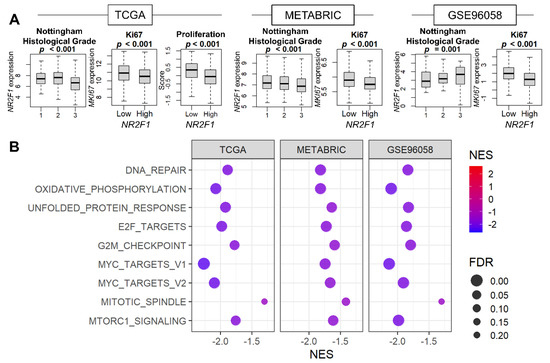 Association of NR2F1 expression with cell proliferation−related measurements and pathways. (A) Boxplots of NR2F1 expression by Nottingham histological grade and MKi67 expression in three cohorts. Proliferation score based on NR2F1 high vs. low expression in TCGA cohort. The Kruskal–Wallis H test was used for three groups, and the Mann–Whitney U test was used for two−group comparison. (B) Hallmark gene sets were significantly enriched in the low NR2F1 group in all three cohorts by GSEA.
