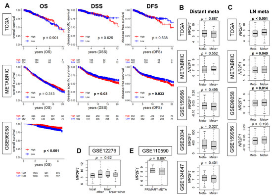 Association of NR2F1 with clinical parameters. (A) Kaplan–Meier curves of overall survival (OS), disease−specific survival (DSS), and disease−free survival (DFS) based on the high and low NR2F1 expression in three large cohorts. Log−rank test was used for the analysis, and significant p values are shown in bold. (B) Boxplots showing NR2F1 expression between patients with (Meta+) and without (Meta−) distant metastasis in the five cohorts. (C) Boxplots showing NR2F1 expression between patients with (Meta+) and without (Meta−) lymph node metastasis in the four cohorts. (D) The boxplot shows NR2F1 expression of primary breast cancer by the known site of relapse. (E) The boxplot shows NR2F1 expression of primary and metastatic breast cancer. Cohort names are indicated in the figure, and Mann–Whitney U and Kruskal–Wallis H tests were used for analysis. Significant p values are shown in bold. p < 0.05 was considered significant.