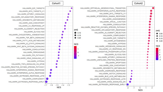 Pathway analysis of cancer cells that expressed any amount of NR2F1. Dot plots showing GSEA comparing cancer cells with positive and negative NR2F1 expression in single−cell Cohort 1 (left) and Cohort 2 (right). Only significant gene sets from HALLMARK are shown in the figure. The size of each dot represents adjusted p value, and the x−axis and color tone represent NES.