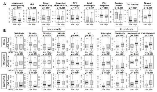Association of NR2F1 with immunity within the tumor microenvironment. (A) Boxplots showing various scores based on high and low NR2F1 expression in TCGA. Intratumoral heterogeneity, homologous recombination deficiency (HRD), silent/non-silent mutation rate, SNV/Indel neoantigen, interferon gamma response, fraction altered, tumor-infiltrating lymphocytes (TIL) fraction, and stromal fraction. (B) Boxplots showing immune and stromal cell fractions between NR2F1 high and low groups in three large cohorts. Mann–Whitney U test was used to compare the two groups, and p values are shown in bold for significant results (p < 0.05).