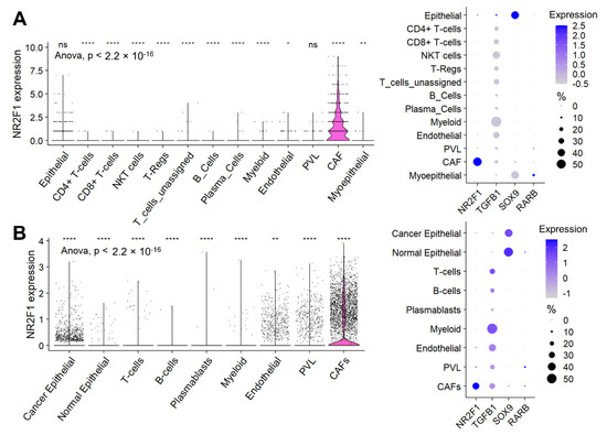 Expression of NR2F1 and dormancy−related genes by cell types. (A) The violin plot on the left shows NR2F1 expression of single-cell Cohort 1 by cell type: epithelial cells, CD4+ T-cells, CD8+ T-cells, natural killer T-cells (NKT), regulatory T-cells (T-reg), unassigned T-cells, B-cells, plasma cells, myeloid cells, endothelial cells, perivascular like cells (PVL), cancer-associated fibroblast (CAFs), and myoepithelial cells. One dot represents one cell. After multi-group comparison, baseline NR2F1 expression and expression in each cell type were compared in two groups by one-way ANOVA test. The dot plot on the right shows NR2F1, TGFB1, SOX9, and RARB expression by cell type in the single-cell Cohort 1. The size of each dot indicates the number of cells, and the purple intensity indicates the expression level. (B) The violin plot on the left shows NR2F1 expression of single-cell Cohort 2 by cell type: cancer epithelial cells, normal epithelial cells, T cells, B cells, plasmablasts, myeloid cells, endothelial cells, PVL, and CAFs. The dot plot on the right shows NR2F1, TGFB1, SOX9, and RARB expression by cell type in the single-cell Cohort 2. Symbols in the figure are as follows: ns, p > 0.05; *, p ≤ 0.05; **, p ≤ 0.01; ****, p ≤ 0.0001.