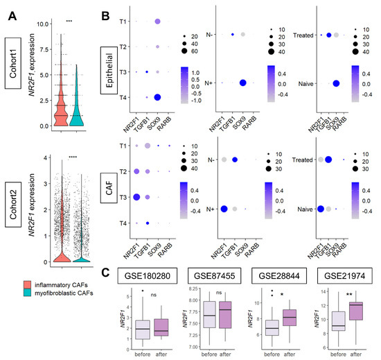 (A) Violin plots showing NR2F1 expression of inflammatory CAF (iCAF) and myofibroblastic CAF (myCAF) of the two single−cell cohorts. One dot represents one cell. One−way ANOVA test was performed, and *** indicates p ≤ 0.001. (B) Dot plots showing NR2F1, TGFB1, SOX9, and RARB expressions in epithelial (cancer) cells and CAFs of single−cell Cohort 2 by T category of AJCC TNM staging, with and without lymph node metastasis, and with and without prior drug therapy. The size of each dot indicates the number of cells, and the purple intensity indicates the expression level. (C) Boxplots showing NR2F1 expression before and after neoadjuvant chemotherapy in the four cohorts. Mann–Whitney U test was used for analysis, and the symbols in the figure are as follows: ns, p > 0.05; *, p ≤ 0.05; **, p ≤ 0.01, ****, p ≤ 0.0001.
