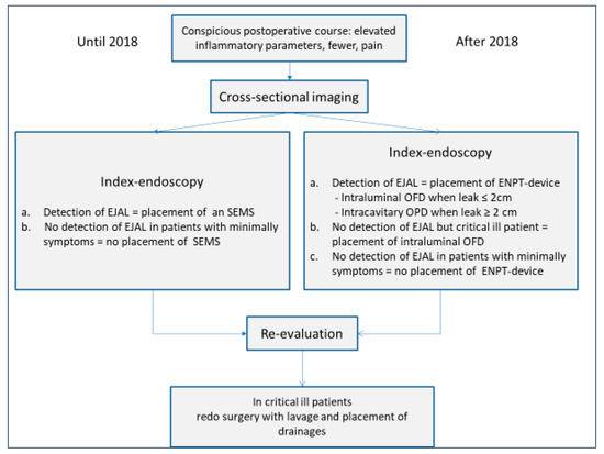 We present a comparative case series on 14 patients treated for EJAL after oncological gastrectomy with primarily endoscopic treatment strategies. Five patients were treated with stents, and nine patients were treated with ENPT. In all patients, the anastomosis was preserved, and sepsis control was achieved by primarily endoscopic and secondarily surgical treatment. There is currently no standard algorithm for the management of EJAL. Until 2018, in our clinic, patients with EJAL were treated with covered stents and then with ENPT according to our internal clinical guidelines, which are regularly updated in accordance with the literature and discussion by an interdisciplinary board. Clipping, a good option for fresh leaks with good perfusion, was not performed because of the late diagnosis of EJAL [19].
