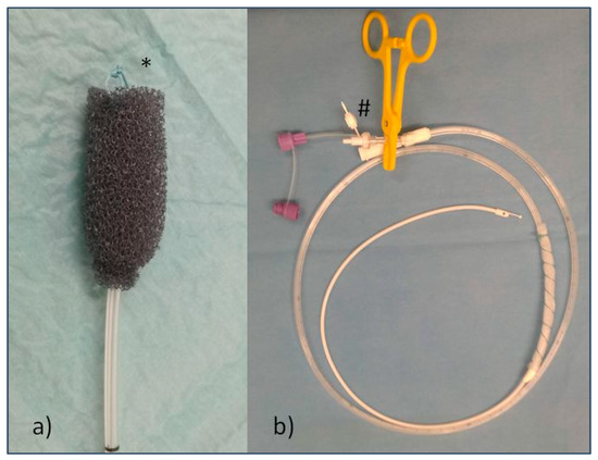 Illustrations of the two ENPT devices used; (a) OPD (open-pore polyurethane sponge) with suture loop (*) for forceps maneuver; (b) OFD (open-pore film drainage), prepared Freka® Trelumina tube; the gastric part is wrapped with CNP Drainage Film and fixed with suture, and the venting tube is clamped (#).