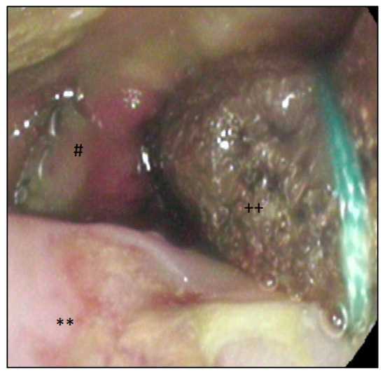 The open-pore film drainage (OFD) for endoluminal therapy was handmade, as previously described by G. Loske et al. [16], by wrapping a thin open-pore double-layered drainage film (Suprasorb® CNP, Drainage Film; Lohmann & Rauscher International GmbH & Co.KG, Rengsdorf, Germany) around the distal end of a gastric tube or the gastric segment of a nasojejunal feeding tube (Freka® Trelumina, Fresenius Kabi Deutschland GmbH, Bad Homburg, Germany). Sutures (MersileneTM, Polyester, 4 Ph. Eur., Ethicon®, Norderstedt, Germany) were used for fixation of the drainage film around the tube. Drain insertion took place via nasal positioning and endoscopic guiding with a grasper. The handmade OFD on an intestinal feeding tube is shown in Figure 2b. Venting tubes in trilumen enteral feeding tubes had to be closed for ENPT (shown with a yellow clamp #). Re-endoscopies were performed every five to seven days. Figure 3 shows the endoscopic findings after implementation of an OFD.