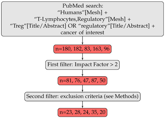We searched PubMed for all articles (as of 2020) related to our topic, with the search words “Humans” [Mesh] AND “T-Lymphocytes, Regulatory” [Mesh] AND (“Treg” [Title/Abstract] OR “Tregs” [Title/Abstract] OR “regulatory T” [Title/Abstract]), adding the cancer in which we were interested—breast, colorectal, gastric, lung and ovarian cancers—as a MeSH term. We added a second filter, narrowing the selection to articles published in a journal with an impact factor above 2 (we used the 2-years impact factor of 2019). We identified 81 articles for breast cancer, 76 for colorectal cancer, 47 for gastric cancer, 87 for lung cancer and 50 for ovarian cancer. Finally, we also added the following exclusion criteria: focus on cells other than human Tregs (mouse Tregs, regulatory B cells, CD8 Tregs), focus outside the primary tumor (metastasis, relapsed cancer, tumor lines, in vitro systems), patients treated with immunotherapy or in a context of dysimmunity, missing information (markers used, anatomic location, number of patients), review articles. In particular, we excluded studies with patients treated by immunotherapy as we were interested in studying an unperturbed TIME. We have, however, included studies concluding on the prognostic role of Tregs with the whole cohort (PMIDS 17135638, 22842982, 23075422, 22879926), or only part of the cohort (PMIDS 21521526, 27494875, 19064967, 24675384, 31681276, 21792941) having received chemotherapy, radiotherapy or hormonal therapy. We ended up with a total of 23 articles on breast cancer, 28 on colorectal cancer, 24 on gastric cancer, 35 on lung cancer and 20 on ovarian cancer, and the selection process has been conducted by one of the authors.